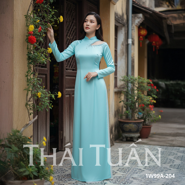 Bộ Áo Dài May Sẵn Cao Cấp Phối Ngọc Màu Xanh Ngọc 1W99A204