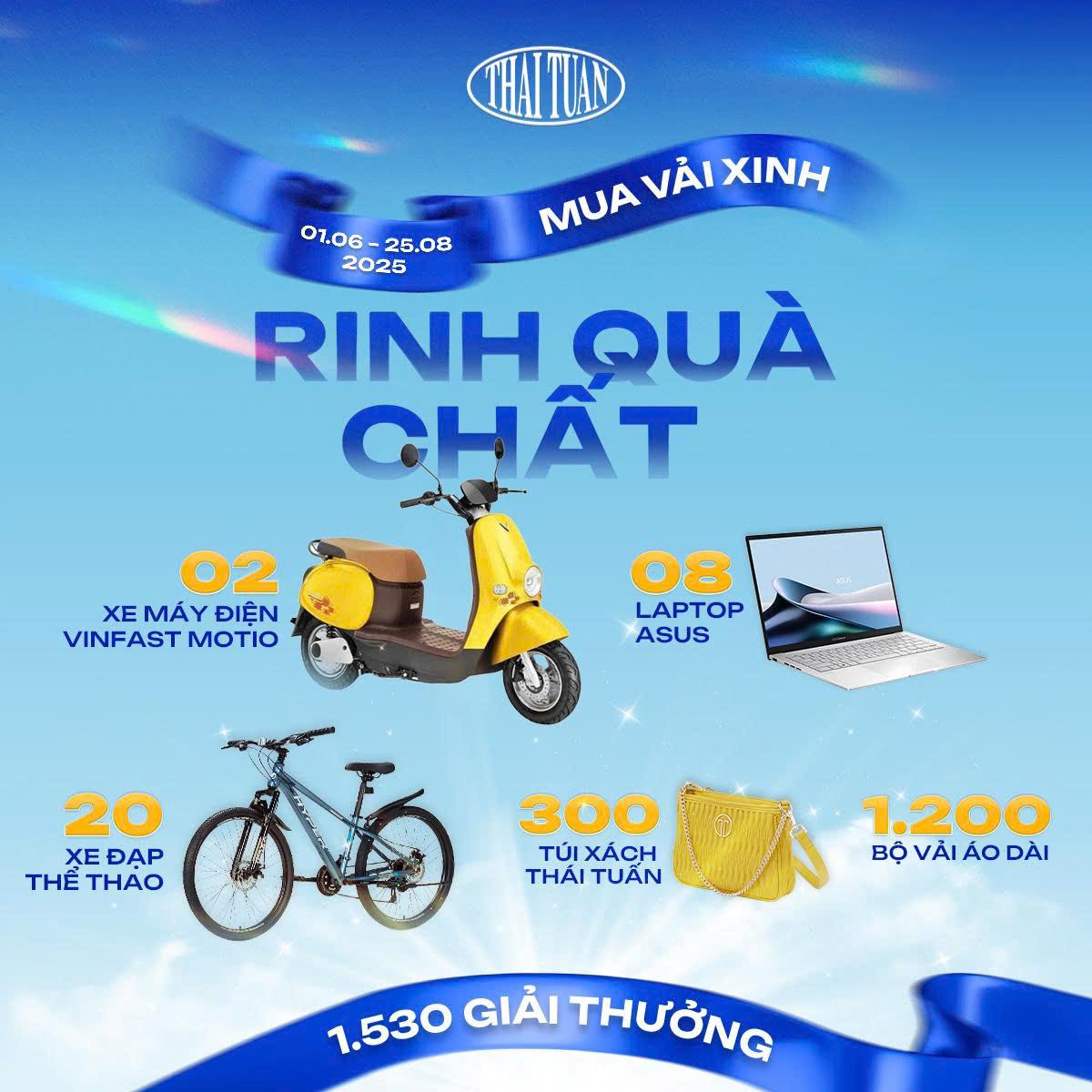 Nhằm tri ân khách hàng đã luôn tin tưởng và đồng hành, từ ngày 01.06 đến hết ngày 25.08.2025 Công ty Cổ phần Tập đoàn Thái Tuấn triển khai chương trình khuyến mãi đặc biệt “MUA VẢI XINH – RINH QUÀ CHẤT” với 1.530 phần quà giá trị lên đến hàng trăm triệu đồng dành tặng quý khách hàng trên toàn quốc.